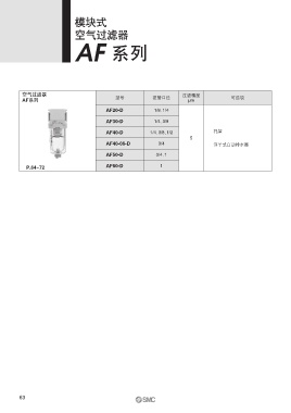 模块式 空气过滤器 AF 系列 空气过滤器 过滤精度 AF系列 型号 接管口径 μm 可选项 AF20-D 1/8、 1/4 AF30-D 1/4、 3/8 AF40-D 1/4、 3/8、 1/2 托架 5 AF40-06-D 3/4 浮子式自动排水器 AF50-D 3/4、 1 P.64~72 AF60-D 1 63