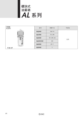 模块式 油雾器 AL 系列 油雾器 AL系列 型号 接管口径 可选项 AL20-D 1/8、 1/4 AL30-D 1/4、 3/8 AL40-D 1/4、 3/8、 1/2 托架 AL40-06-D 3/4 AL50-D 3/4、 1 P.92~97 AL60-D 1 91