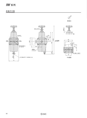 IW 系列 外形尺寸图 ø15 板安装孔 MAX.4 M14×P1.5 板 BLEED 3.2 68 28 208 60 SUP OUT A向视图 ø54 46 140 10 压力计连接口 76 2×Rc1/4 7 46 连接口 2×Rc1/4 (20) 4×M6×1深10 40 排水 向左旋转打开,向右旋转关闭 A向视图 74 41