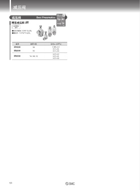 减压阀 减压阀 Best Pneumatics 精密减压阀 IR 压力控制 元件 ●设定灵敏度:0.2%F.S.以内。 ●重复性:±0.5%F.S.以内。 系列 接管口径 设定压力(MPa) IR1000 1/8 0.005~0.2 0.01~0.4 IR2000 1/4 0.01~0.8 0.01~0.2 IR3000 1/4, 3/8, 1/2 0.01~0.4 0.01~0.8 51