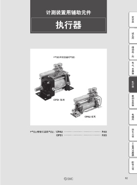 计测装置用辅助元件 定位器 执行器 减压阀 继动器/阀 P气缸(带定位器的气缸) 电 - 气 变换器 执行器 检测变换器 CPS1 系列 电磁阀 CPA2 系列 净化元件 P气缸(带定位器的气缸)/CPA2 …………………………………………………………… P.63 CPS1 …………………………………………………………… P.63 工业用过滤器 配管元件 62